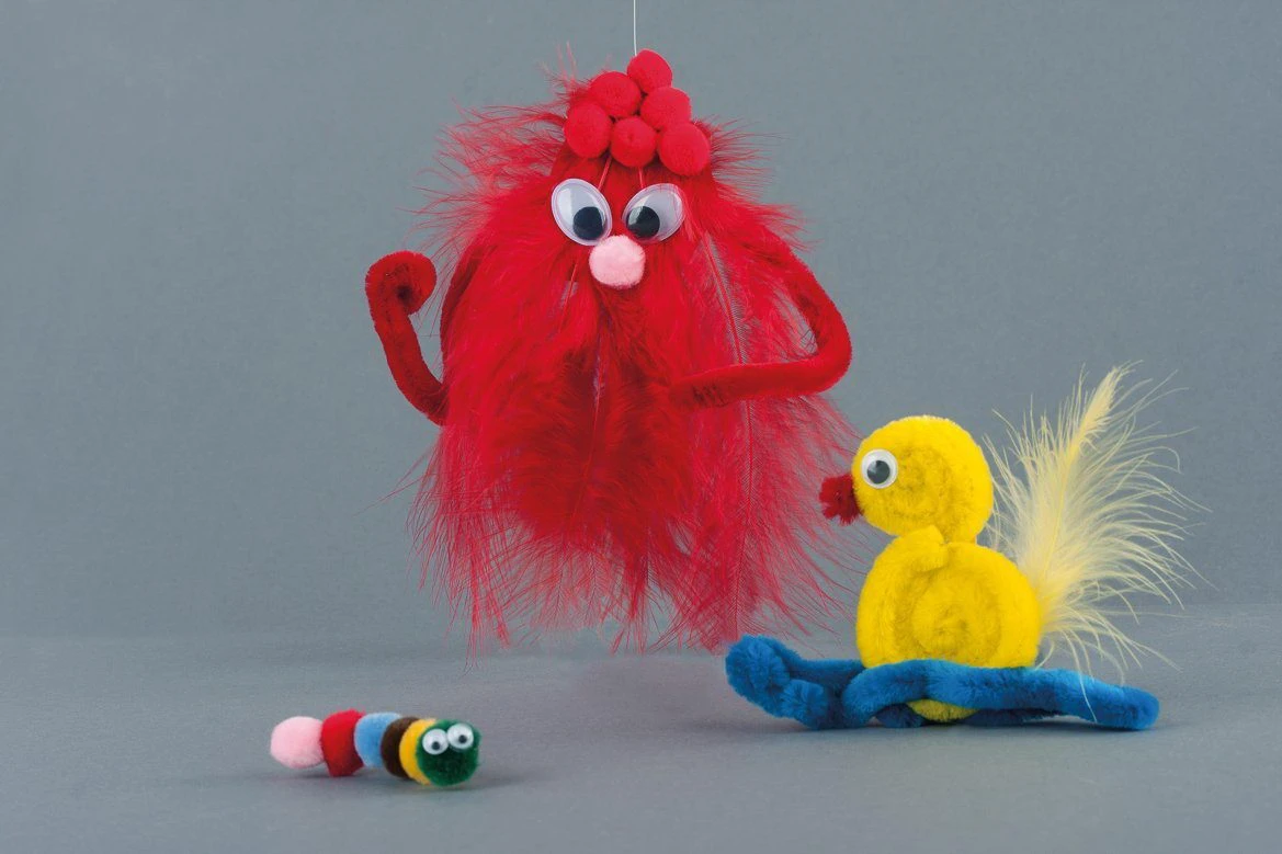 Mit den flauschigen Pfeifenreinigern, Wackelaugen, Pompons, Federn, usw. macht zuerst das Basteln Spaß, dann das Spielen oder Verschenken. Inklusive Klebstoff.
