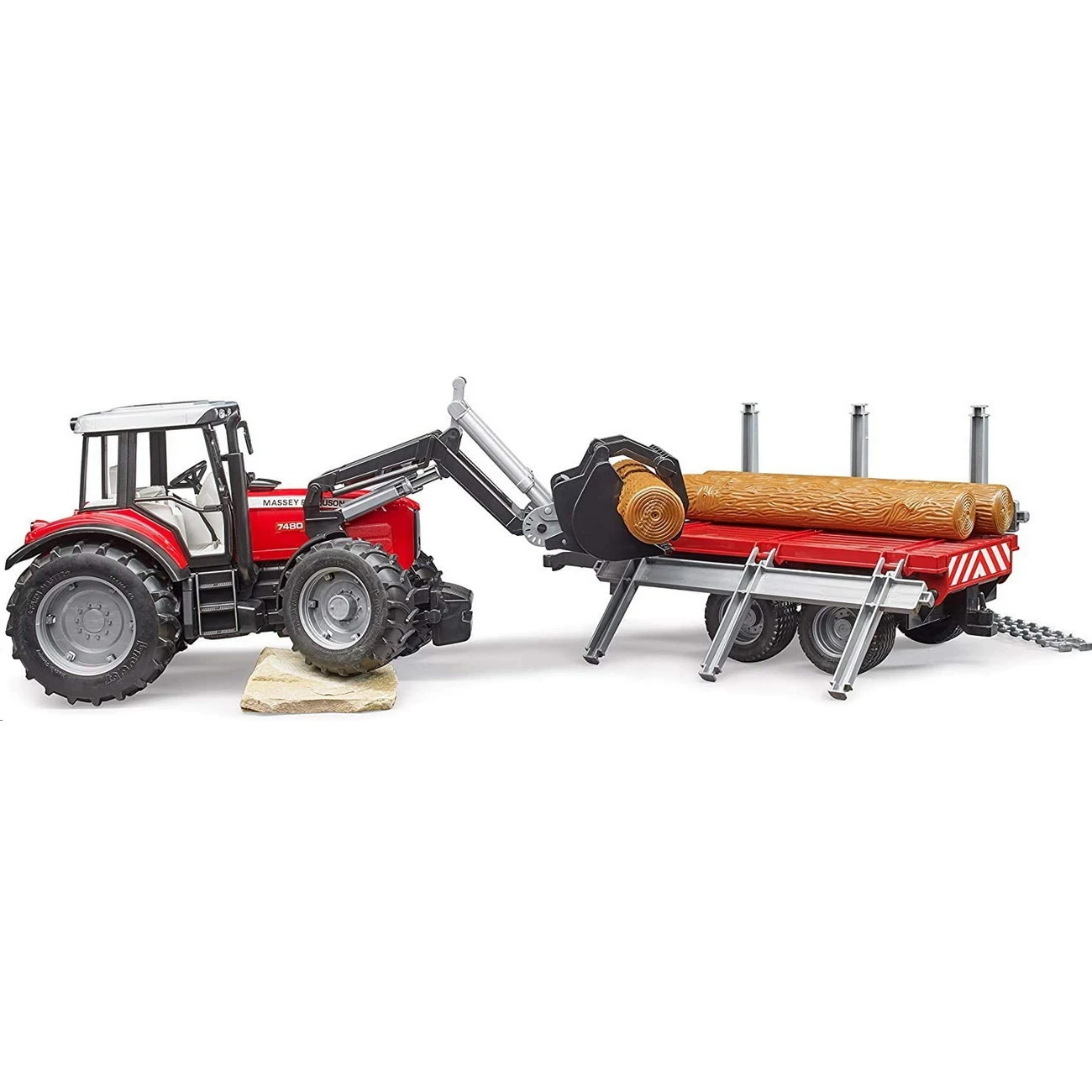 Massey Ferguson 7480 mit Frontlader und Holztransportanhänger und 3 Baumstämmen (BRUDER 02046)