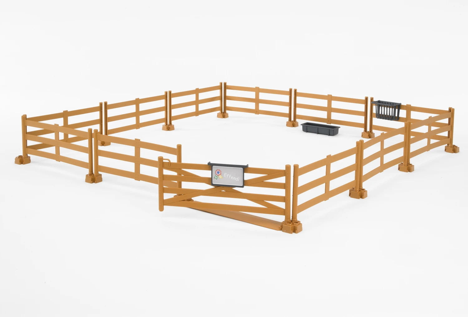 Das Set besteht aus 11 einzelnen braunen Zaunelementen, die mit Hilfe ihrer Standfüße (natürlich auch braun) untereinander verbunden werden können. Zusammen mit dem Torelement mit Bodenschwelle kann man zum Beispiel einen Bereich von 53,5 x 53,5 cm abzäunen. Selbstverständlich kann man jedoch auch eine andere Kombination aufbauen, zum Beispiel entlang eines Gebäudes oder natürlich auch viel größer, wenn man mehrere Sets miteinander kombiniert. Komplettiert wird der Pferdezaun mit so nützlichem Zubehör wie einer einhängbaren Heuraufe, einem Futtertrog und einem Namensschild, das am Tor befestigt werden kann. Insgesamt ein sehr schöner brauner Weidezaun, der Ihr Hofensemble ergänzt.