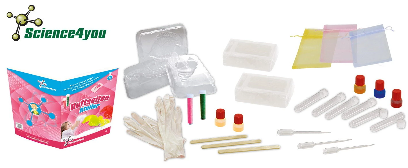 Das Material reicht aus für 8 Versuche. Zusätzlich benötigst Du Utensilien aus der Küche und je nach Seifenrezept auch getrocknete Blüten, Haferflocken und Knete.