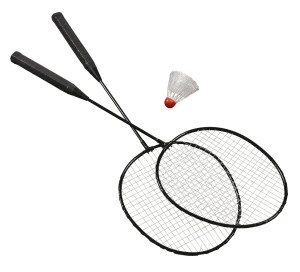 Die beiden Schläger bestehen aus schwarzem Metall. Die Bespannung ist weiß. Ein Kunststoff Federball ist mit dabei.