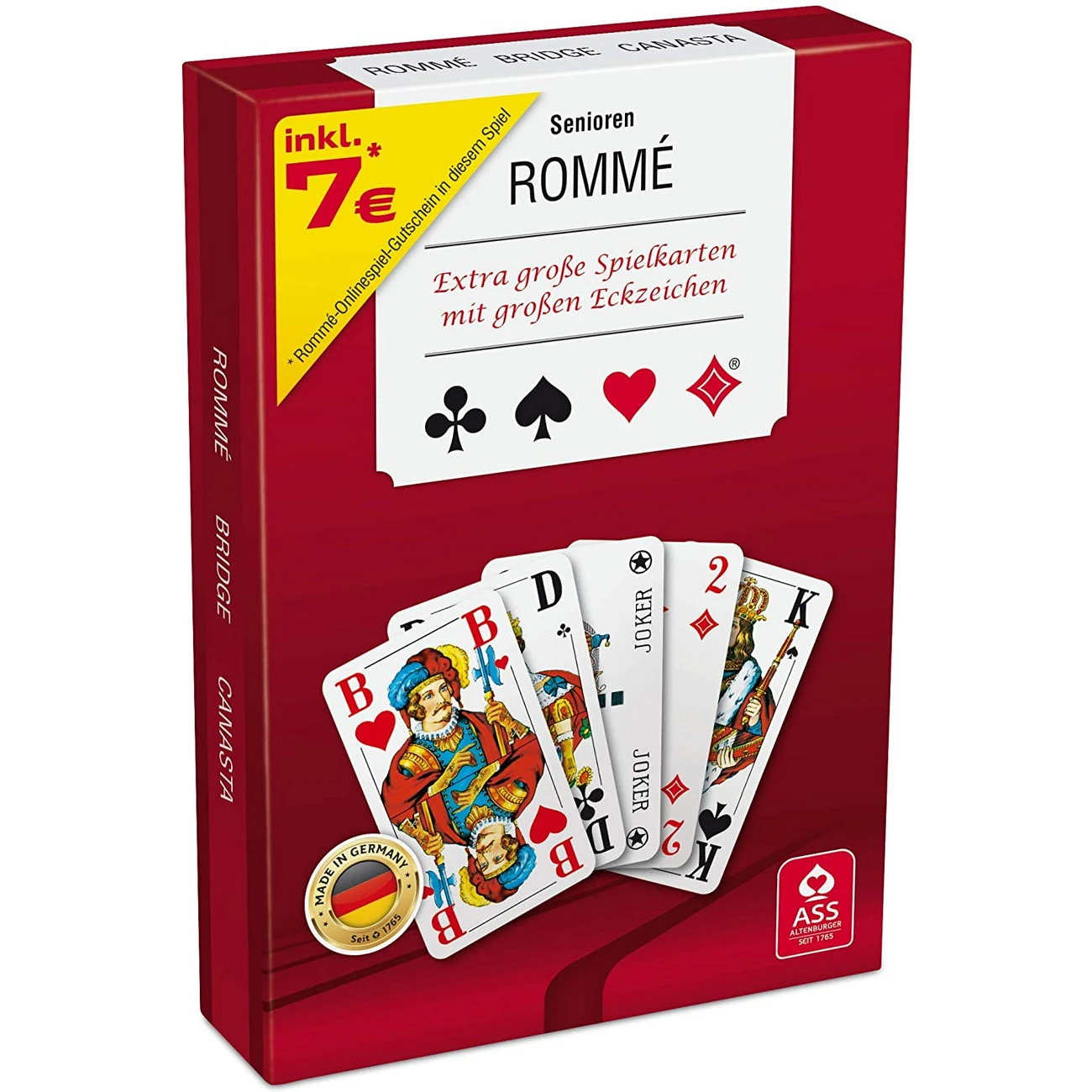 Spielset mit 2 x 55 Blatt Rommée Karten in Stülpdeckel Schachtel.
