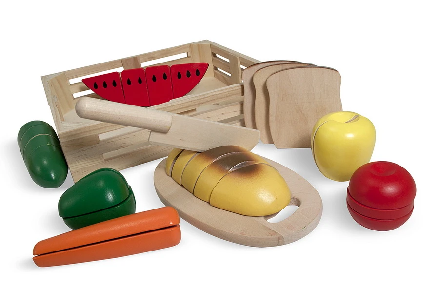 Sie erhalten mit diesem Set acht verschiedene Lebensmittel: einen Laib Brot, ein Stück Melone, eine Gurke / Zucchini, eine Möhre, eine Tomate, eine grüne Paprika, einen Apfel und ein Stück Sandwich Brot. Diese Lebensmittel bestehen jeweils aus Einzelteilen, die mit Klettverschluss zusammengefügt sind. Mit dem beiliegenden Holzmesser kann das Essen auf dem Brett zerteilt werden. Beim „Schneiden“ entsteht sogar ein Geräusch. Anschließend können die Teile wieder zusammengefügt werden und der Spaß beginnt von vorn.