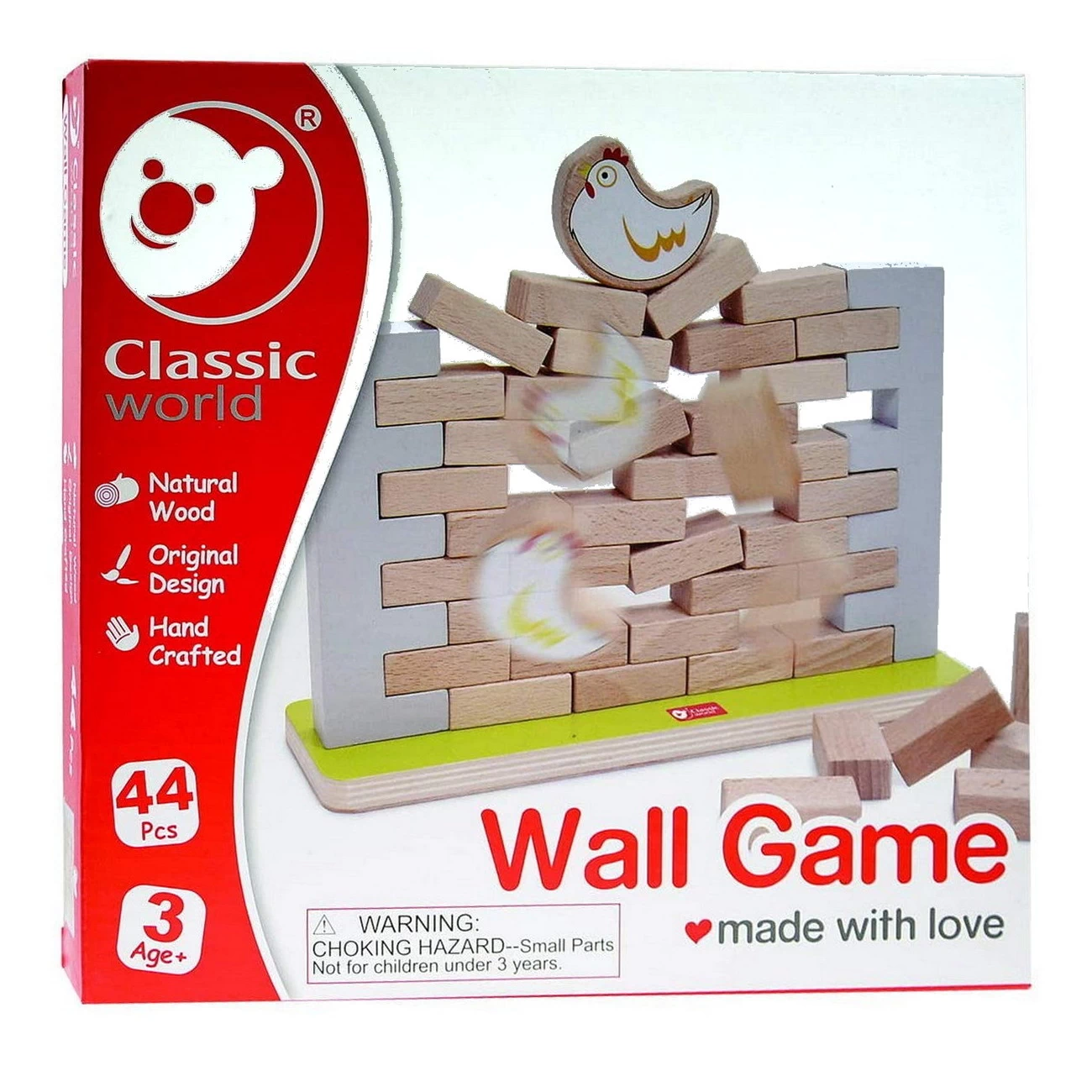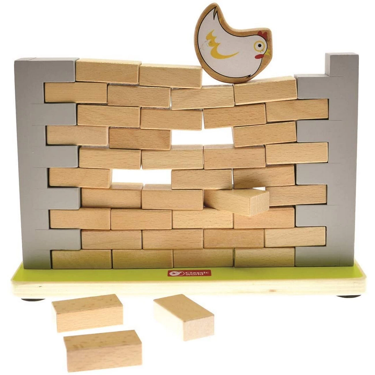 Ganz oben sitzt ein Huhn auf der Mauer. Nacheinander nehmen die Spieler nun Steine aus der Mauer heraus. Doch aufgepasst! Bei wem die Mauer einstürzt, hat verloren.