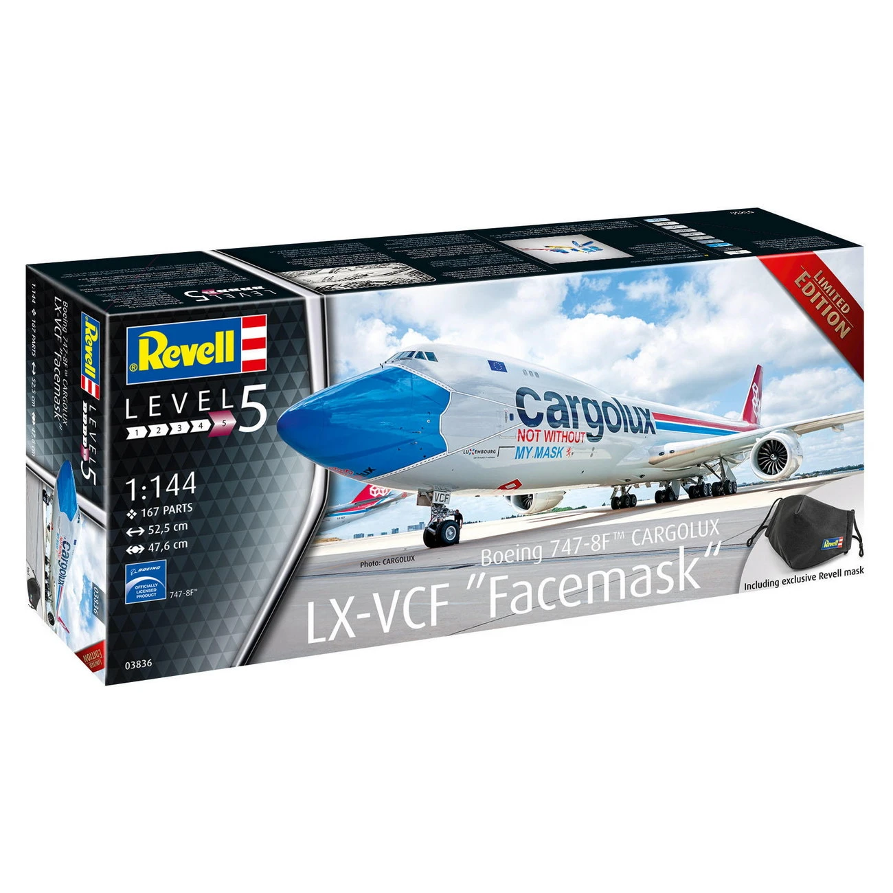 Nicht ohne Maske! Dieser Grundsatz gilt mittlerweile fast überall und die luxemburgische Frachtfluggesellschaft CARGOLUX trägt ihn mit einer speziell lackierten Maschine nun sogar um die Welt. Die im Set enthaltene Revell-Maske macht den limitierten Bausatz außerdem zum Sammlerstück.