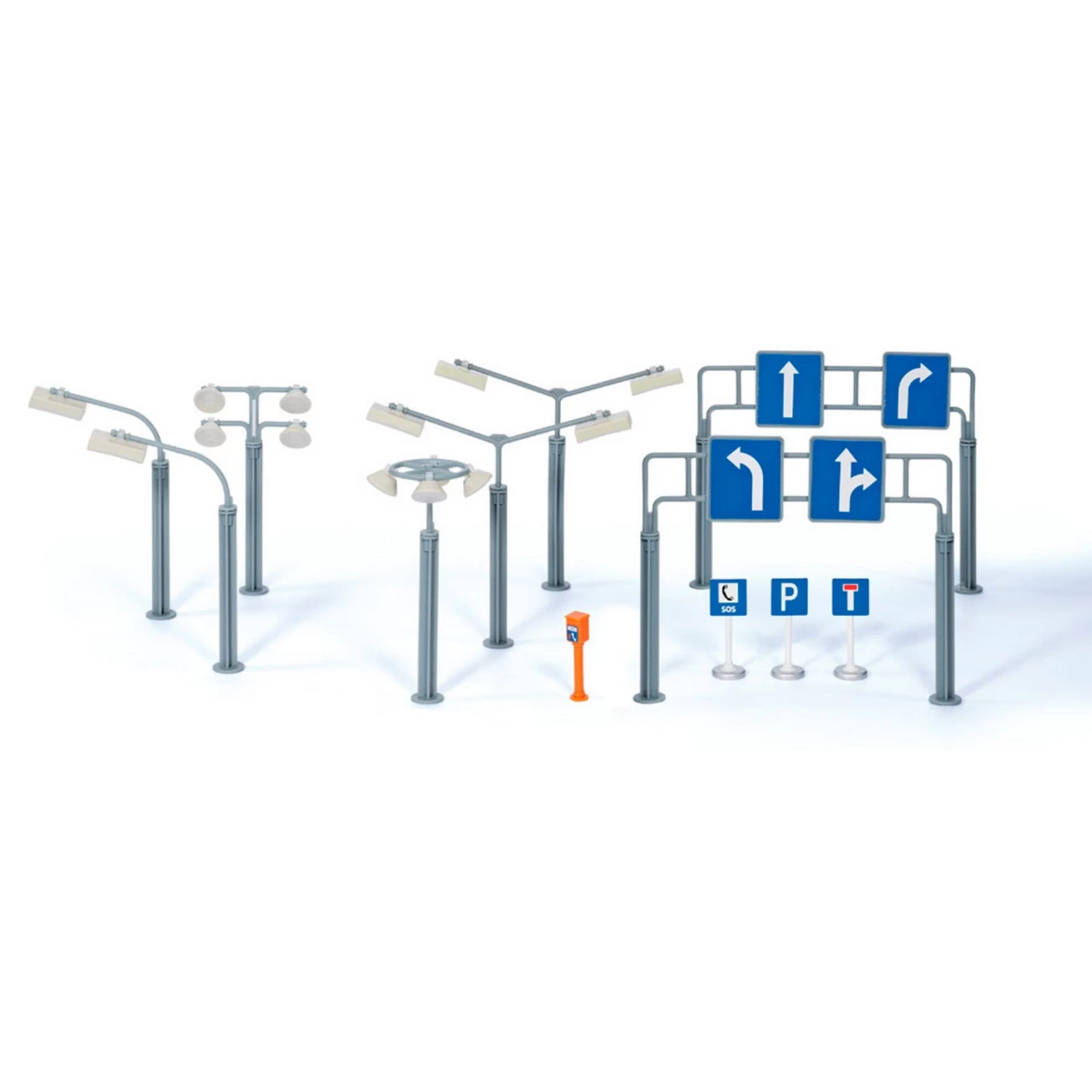 Ergänzungsset zur SIKUWORLD mit Strassen-, Parkplatz und Baustellenleuchten sowie diversen Verkehrsschildern.
