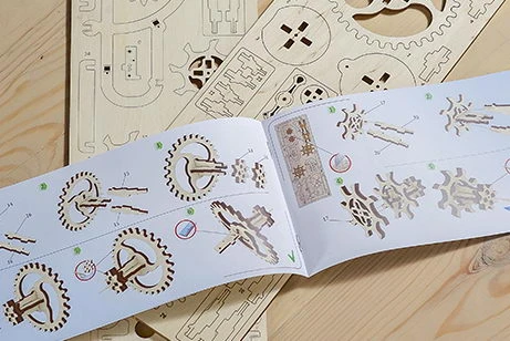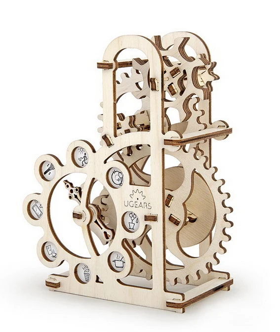 Das Ugears Dynamometer verwandelt Luftdruck in Bewegung. Durch Anblasen des oberen Zahnrads setzt sich das System des Ugears Modells in Bewegung. Der Pfeil springt von Piktogramm zu Piktogramm und vermittelt Ideen zu Dingen, die Sie vielleicht unternehmen möchten.